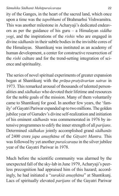 Shantikunj has emerged over the years as a unique center and fountain-head of a global movement of Yug Nirman Yojna (Movement for the Reconstruction of the Era) for moral-spiritual regeneration in the light of hoary Indian heritage.